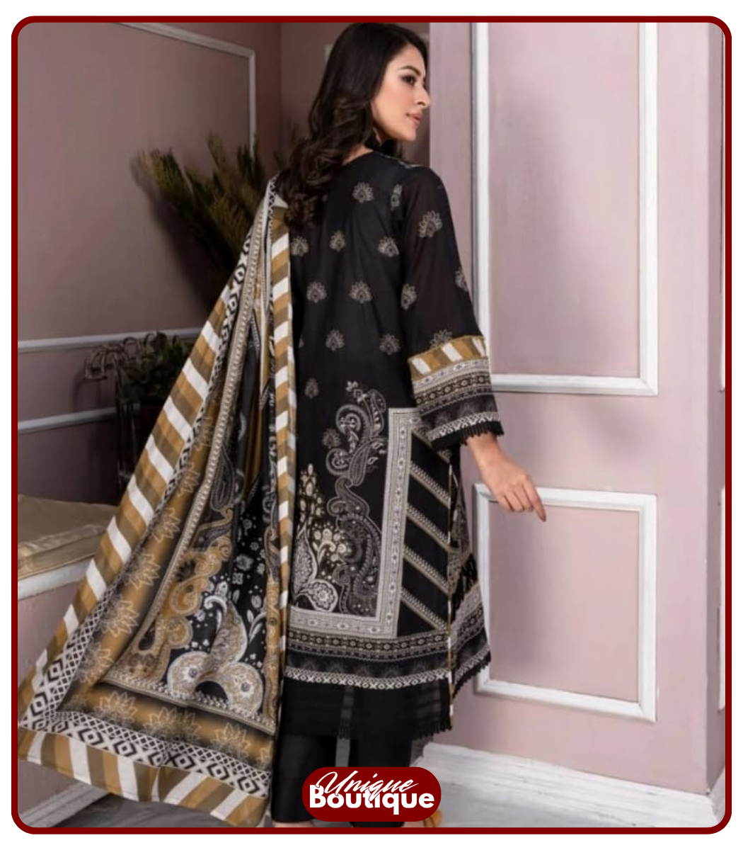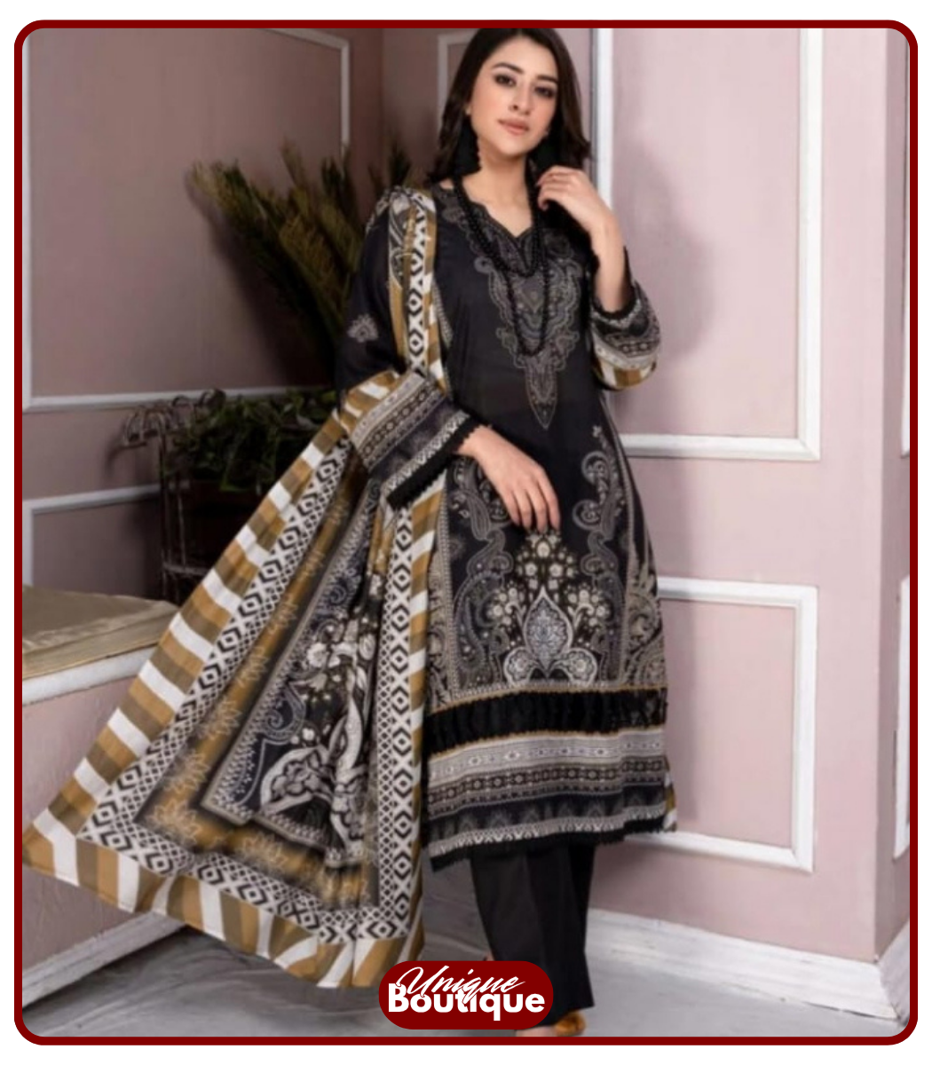 Elegant black printed Baroque linen 3-piece suit with soft, warm and premium winter fabric. Stylish digital prints, smooth texture and perfect comfort for daily winter wear.